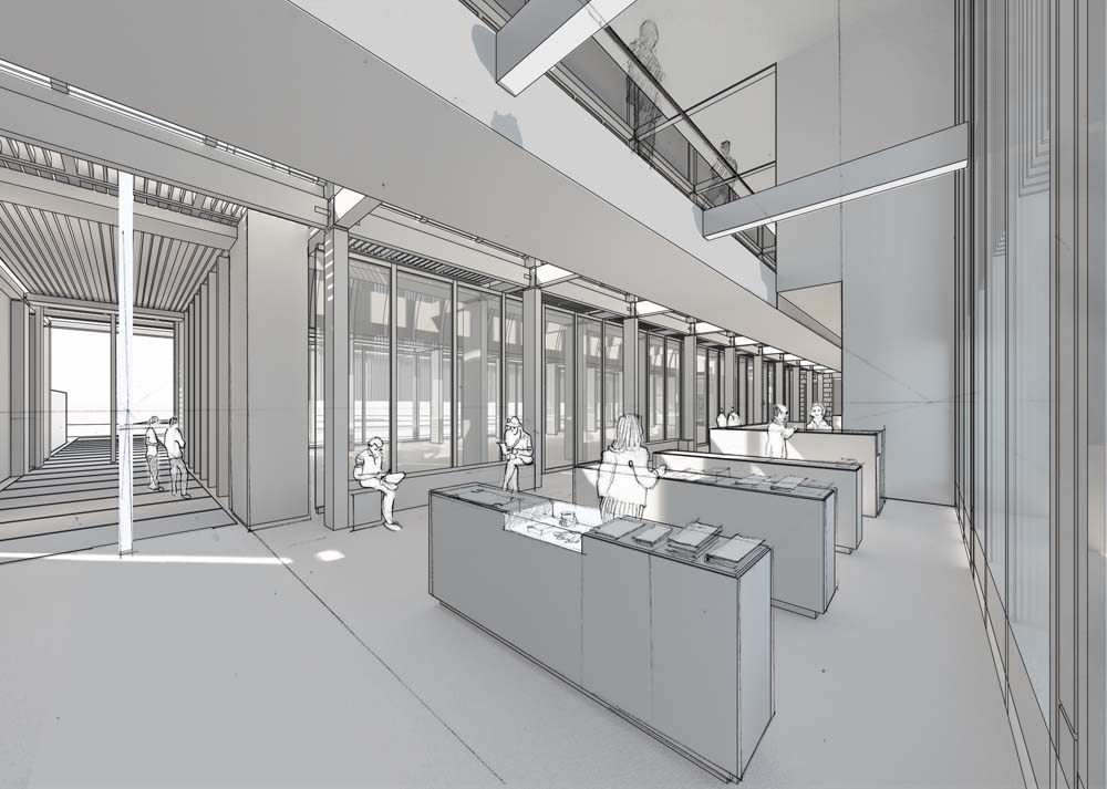 Simplicité et harmonie Les libertés prises dans l'implantation générale de l'ouvrage sont dictées par la volonté d'une clarté d'organisation et de distribution des espaces. La perception en plan de l'agencement proposé est simple. Les alignements sont respectés au nord comme au sud, dictés par les proportions et les mesures des bâtiments conservés. La trame proposée, constituée de lignes successives de poteaux, dégage trois vaisseaux parallèles différents. Le premier vaisseau au nord abrite les espaces d'entrée et de circulation, d'accueil, de billetterie et de boutique. La trame virtuelle se prolonge à l'est et opère la liaison longitudinale de tous ces espaces, comme à l'ouest, vers l'exposition temporaire. Ce dispositif est accentué par des percements intérieurs généreux des murs conservés qui permettent de lier les espaces entre eux. Le second vaisseau, au centre, constitue l'espace d'exposition permanente, vaisseau enchâssé, centre de la nef, il se démarque des autres parties par une géométrie généreuse voûtée en berceau. Le troisième vaisseau, au sud, termine la composition. Galerie couverte, ce dernier vaisseau sert d'espace intermédiaire, de filtre et d'encadrement de l'exposition centrale. Échelle de mesure – ligne de portée La perception en volume est tout autre et chaque vaisseau a sa propre géométrie : Alignement au nord, verticalité et respect de la continuité urbaine pour le premier, cœur du dispositif et générosité du vaisseau central comme enchâssé dans la composition, protection et clôture pour le vaisseau sud sur le jardin. L'érection de la trame de poteaux en élévation génère une série de portiques, une forêt de poteaux dans la profondeur du bâtiment. Cette échelle donne la dimension et la mesure de l'entre-deux, du remplissage du vide entre les parties existantes. C'est aussi une ligne de portée régulière qui devient support de l'enveloppe. C'est enfin un lien entre les parties constituant la longue façade, la ligne de portée s'étendant sur l'ensemble bâti. Cette échelle régulière, ce portique autorise le jeu, la composition de volumes en alignement, mais aussi en retrait et en encorbellement. Le remplissage de chaque vide du portique / échelle étant autonome et répondant aux fonctions en regard : transparence sur la boutique et l'accueil au niveau du visiteur, semi opacité pour certains locaux, opacité pour les autres parties. Ce jeu de surfaces de remplissage qui deviennent des volumes, permet la variété de la façade sur sa grande longueur, la composition de volumes comme autant de notes sur la ligne de portée. |