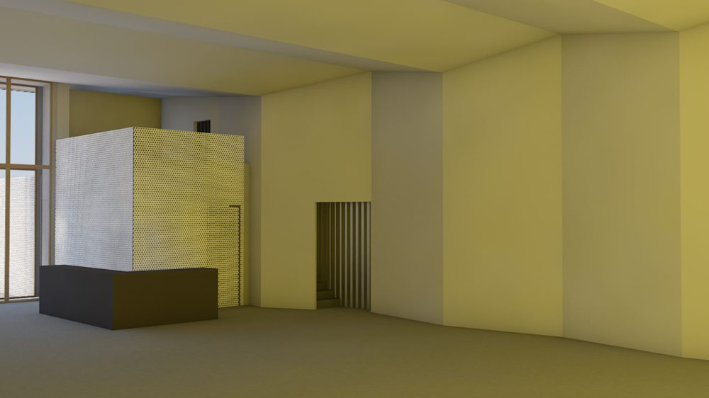 Focus sur la salle polyvalente : La lumière naturelle provient de la façade située au sud-est mais aussi à l'opposé par un éclairage zénithal disposé au fond de la salle, qui en constitue l'équilibre lumineux. Cet éclairage arrière permet également la ventilation naturelle de la salle. Les parois latérales sont aveugles et renforcent l'idée de salle axée vers son jardin. Une correction solaire et aussi acoustique est nécessaire sur la grande façade vitrée qui est positionnée en retrait à l'ombre du débord de toiture. Un brise soleil intermédiaire permettra un contrôle lumineux Traitement des parois intérieures Le traitement des parois est conçu comme un plissement régulier rythmé par la structure de l'ouvrage. Un traitement plus fin et plus résistant sera réalisé sur une hauteur de 2 m. environ. Les parois hautes possèdent des qualités acoustiques par la disposition des plis successifs de l'habillage, mais aussi par le traitement de certaines zones en matériaux absorbants (perforation et absorption). |